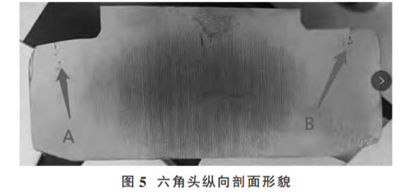 (2)原因分析。將該類問題螺栓六角頭縱向剖開,剖面如圖 5所示,在六角頭墊圈面邊沿的 A、B 處有明顯的裂紋,說明螺栓六角頭墊圈面邊沿存在應(yīng)力集中,在淬火時(shí)形成裂紋,這種裂紋最終將導(dǎo)致螺栓掉頭。