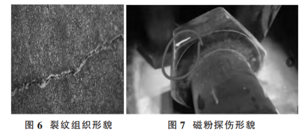 裂紋的金相組織形貌如圖6;磁粉探傷照片如圖 7,標(biāo)識(shí)圈內(nèi)所示墊圈面邊沿有明顯的磁粉堆積。