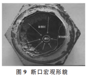 (2)原因分析。通過宏觀、金相、力學(xué)性能、斷口、能譜等綜合檢測(cè)分析,認(rèn)為該案例失效原因是:螺栓加熱時(shí)未熱透,鍛造過程中變形抗力與變形速率不匹配,在六角頭芯部形成裂紋,且裂紋經(jīng)調(diào)質(zhì)處理和使用過程中進(jìn)一步擴(kuò)展,最終斷裂。斷口宏觀形貌如圖 9。
