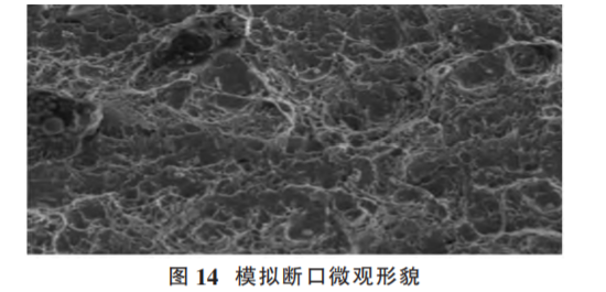 人為斷口觀察。在斷裂螺栓桿部取縱向光滑試樣,采用手動(dòng)敲擊方式獲取模擬斷口進(jìn)行電鏡觀察,微觀形貌為韌窩特征,見圖 14。