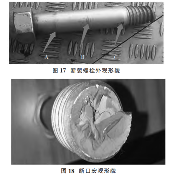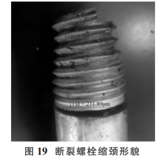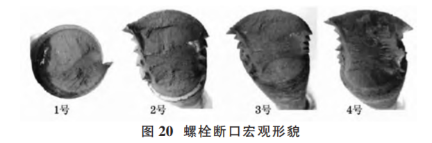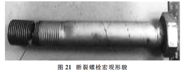 (2)原因分析?,F(xiàn)場(chǎng)勘察時(shí)發(fā)現(xiàn)有 4 顆螺栓的斷口上 存在與螺栓軸向大致垂直的斷裂面,為首斷裂件 (如圖 20);其他斷裂螺栓斷口均比較粗糙,存在明顯的彎曲變形和塑性變形特征,為后斷裂件。
