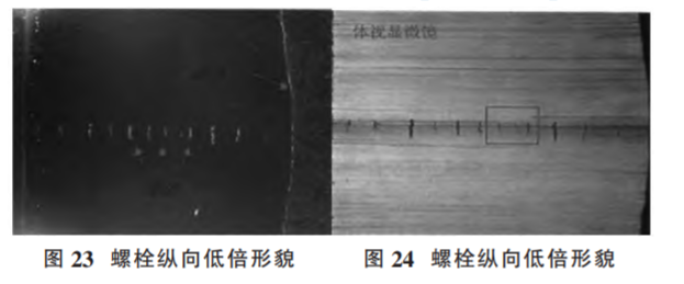 圖25為斷裂螺栓末端縱截面取樣位置及縱截面宏觀形 貌,可見在距離末端第 3 扣螺紋對(duì)應(yīng)位置內(nèi)部存在橫向裂紋。