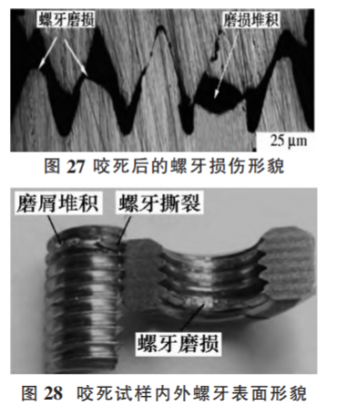 快速預(yù)緊和快速拆卸引起的螺牙間高溫導(dǎo)致不銹鋼螺牙表面發(fā)生嚴(yán)重黏著磨損;黏著磨損產(chǎn)生的磨屑在螺牙間堆積,阻礙了螺牙的旋合過程并最終引起咬死。