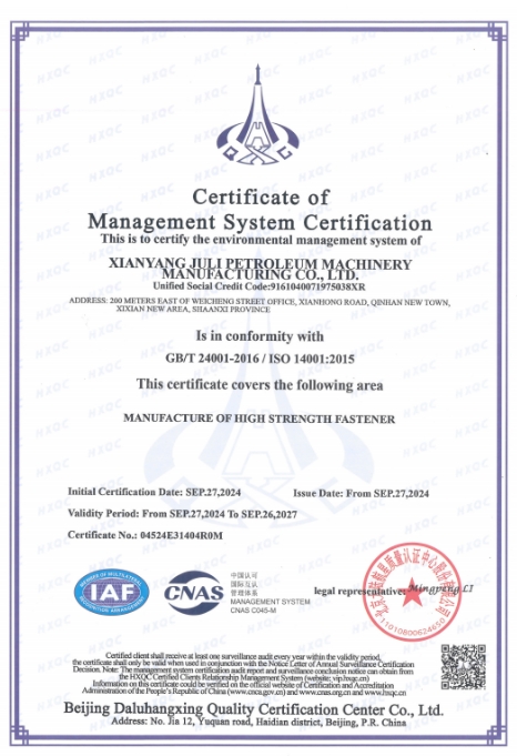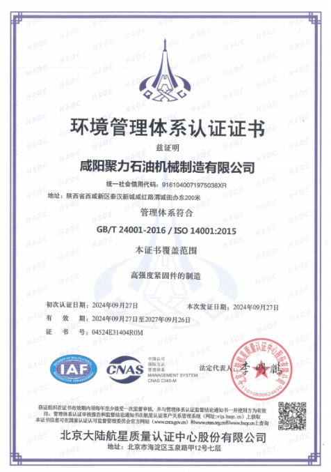 咸陽聚力石油機(jī)械制造有限公司取得了ISO9001: 2015質(zhì)量體系認(rèn)證;環(huán)境和職業(yè)健康ISO14001:2015、ISO45001:2018體系認(rèn)證;全國標(biāo)準(zhǔn)件科技情報(bào)理事單位;中石油供應(yīng)商一級(jí)網(wǎng)絡(luò)單位;產(chǎn)品取得了國家特種設(shè)備(壓力管道用緊固件)生產(chǎn)許可證;公司先后獲得了兩項(xiàng)專利。公司產(chǎn)品通過第三方先后出口歐洲、蘇丹、柬埔寨和西班牙等國。